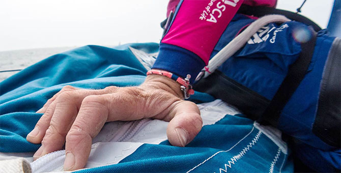 Händer i arbete, våta, kalla, såriga och ömma händer, händer i vila. Om man tar sig en titt på seglarnas händer och hur de förändras under en etapp och under hela tävlingen får man en glimt av vad de faktiskt går igenom. Jag känner ödmjukhet och respekt. de här seglarna är mina hjältar. Här sitter Sophie Ciszek och pustar ut på segelstacken mellan en av många manövrer.