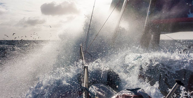 Det här fotot togs under min andra etapp ombord Team SCA, etapp 5 från Auckland till Itajai. Vi har alla säkrade med sele och gör 20-25 knop. Det är vilt, galet och vackert, champagnesegling som Gyro (Carolijn Brouwer) vid storskotet deklarerade med ett stort leende. Plötsligt ropar hon; "Anna-Lena, vänd dig om, kolla in fåglarna!" Jag hade tur som lyckades fånga flocken som vi skar igenom. Det är inte lätt att vara fotograf när havet gång på gång försöker skölja av en från däck.