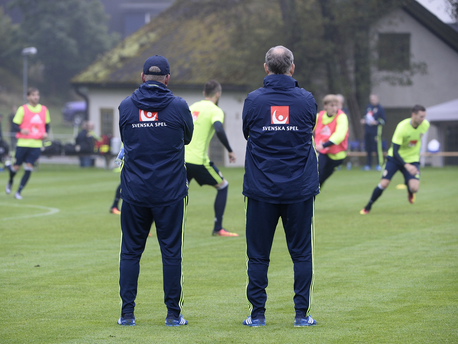 Janne Andersson och Lars Lagerbäck som ett tvillingpar, det nya teamet. Och så just Håkan Sjöstrand i samtal med de båda – under träningen.