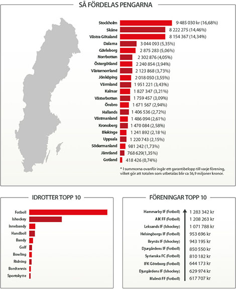 • Hammarby följdes av AIK Fotboll och Leksands IF Ishockey. Elva föreningar fick över en halv miljon kronor.