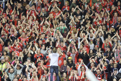 Spelar fotboll - uppe på en folkskara