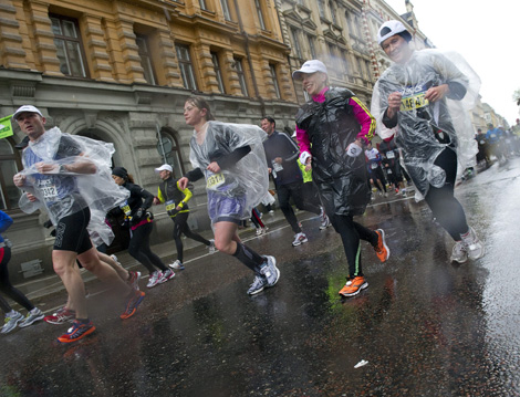 De var hjältar allihopa. Det hade inte gått att hitta en vidrigare dag att genomföre ett maratonlopp än idag. Kvicksilvret var nere på tre grader strax efter start och kröp sen upp till fyra. Vinden låg på runt tio meter/sekund med kastbyar upp till 18 m/s. Lägg på ihällande regn på det och vi får 16 000 genomfrusna löpare. ”När vi sprang i vår klunga på Gärdet var det en som började asgarva, beskriver Andreas Bergstedt den absurda situationen. Han var ändå med och slogs om topplaceringar och var 30:e man i mål. Många av topplöparna krampade mot slutet och de flesta skakade tänder på vägen mot de efterlängtade torra ombyteskläderna. Det var ändå inte många som valda att stanna hemma. 15 968 startande är nästan lika många som fjolårets rekordsiffra. Överraskande få bröt i ruskvädret. 14 686 hjältar tog sig hela vägen i mål. Det innebär att 92 procent av de startande fullföljde, att jämföra med fjolårets 96 procent, i goda förhållanden. Siste man i mål var Karl-Axel Pettersson, SSIF, efter sex timmar, elva minuter och 46 sekunder. Det var hans 34:e raka mara. Karl-Axel har alltså inte missat ett enda lopp, sedan starten 1979. Foto: Maja Suslin, Scanpix