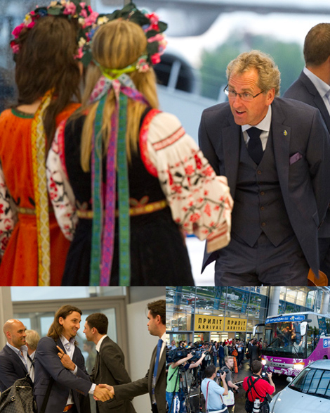 Efter att ha drabbats av en regnstorm anlände fotbollslandslaget något försenat till EM-staden Kiev och Zjuljangflygplatsen på söndagskvällen. En mottagningskommitté hälsade gästerna välkomna, förbundskapten Erik Hamrén bugade djupt inför damern med blommor och Zlatan Ibrahimovic visade också en öppen attityd innan hela gänget satte sig bussen och begav sig mot hotellet. Em-äventyret har börjat. Foto: Fredrik Sandberg, Scanpix
