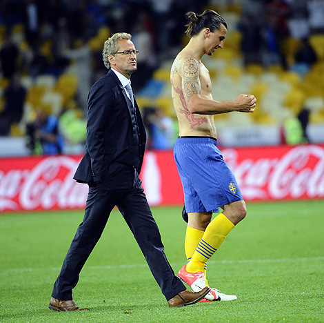Erik Hamrén och Zlatan Ibrahimovic lämnar arenan. 2-3 förlusten mot England på Olympiastadion i Kiev i EM innebär att mötet med Frankrike saknar betydelse. Över huvud taget har den svenska Em-insatsen skapat frågetecken inför framtiden. Och i höst ska Nationalstadion invigas… Foto: Fredrik Sandberg, Scanpix