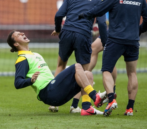 Landslaget tränar på Råsunda, två-målsspel gäller, det är inget lattjande utan det är tuffa närkamper – plötsligt blir det så mycket mera tufft. Olof Mellberg går in med all kraft och hela kroppen på Zlatan Ibrahimovic som inte är uppmärksam. Det smäller rejält, Zlatan ropar till och faller. Det syns hur smärtan är omedelbar och han kastar sig runt för att vem ”förövaren” är. Olof… En av hans kompisar i gänget. Under en bråkdel av en sekund har han en snabb överläggning med sig själv, ska han visa hur förbannad han blev. Och framför allt, hur hade han betett sig om det exempelvis var någon av de nyaste spelarna i landslaget? Foto: Foto Christine Olsson, Scanpix