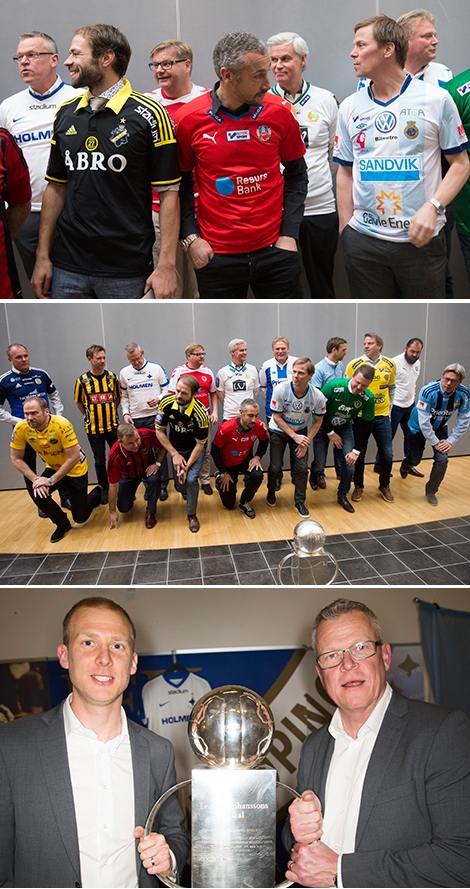 Upptaktsmöte för Allsvenskan med sedvanlig optimistisk gruppering av alla sportreportrar, alla klubbar, SEF och Svensk Fotbollförbundet. Mangrann uppställning, i klartext.